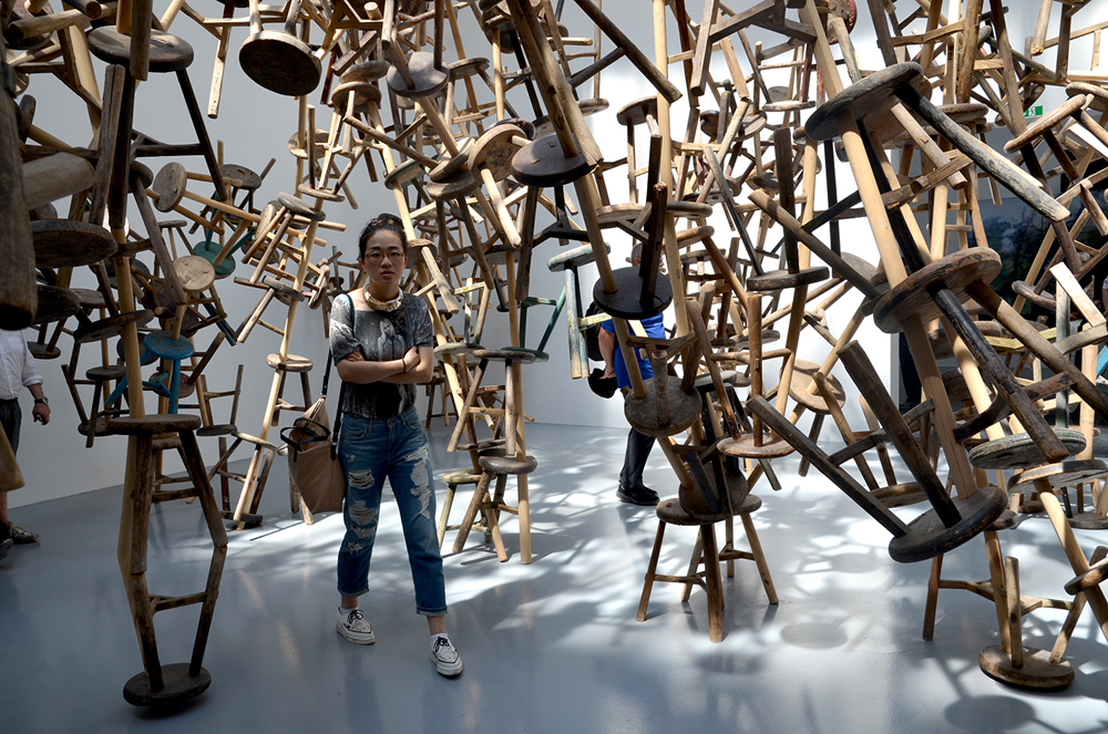 “What I love is the moment when the viewer is so engrossed by what they are seeing and experiencing that they become physically immersed, bodies leaning in or away, perhaps fidgeting or standing completely still. Lost in an idea or image, oblivious to anyone else around. This is often fleeting in a busy exhibition space – someone usually brushes past, interrupting their connection with the work. Witnessing these (most likely) unintentional emotional reactions gave me an insight into the meaning and reading of certain works. For example, in the Central Pavilion, photographer Kohei Yoshiyuki’s perverse cycle The Park (1973) seemed complete as I watched a striking viewer peering back at the voyeuristic images. The domino ‘peering affect’ was there again with Ellen Altfest’s detailed paintings that demanded close viewing. Maria Lassnig’s bright paintings “…depict her body as she experiences it rather than as it appears” (taken from Lassnig’s room sheet) and this seemed to resonate with the captivated audience.