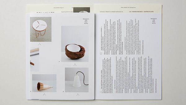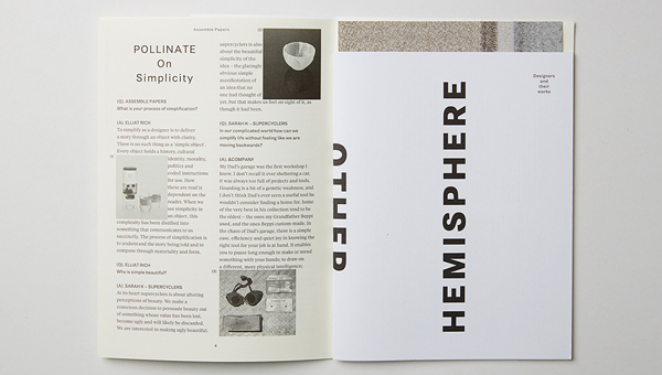 Inside you’ll find two pieces of especially commissioned Assemble Papers editorial (Our POLLINATE article ‘On simplicity‘ and Hen Zeffert’s ASSEMBLAGE essay, ‘Design by the lucky country‘), along with information about the exhibition, designers and their work, and special inserts from selected designers. A range of printing methods and paper stocks have been used and we think the resulting compendium is quite perfect. Bravo team!