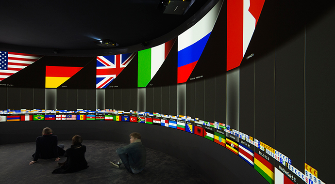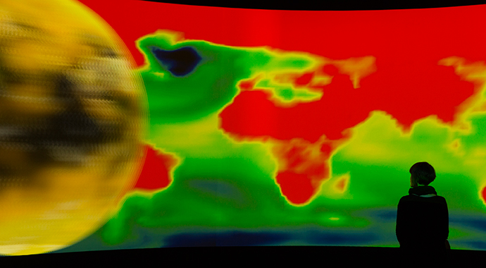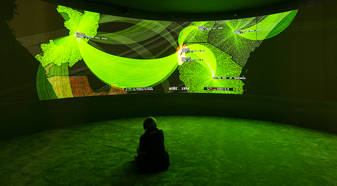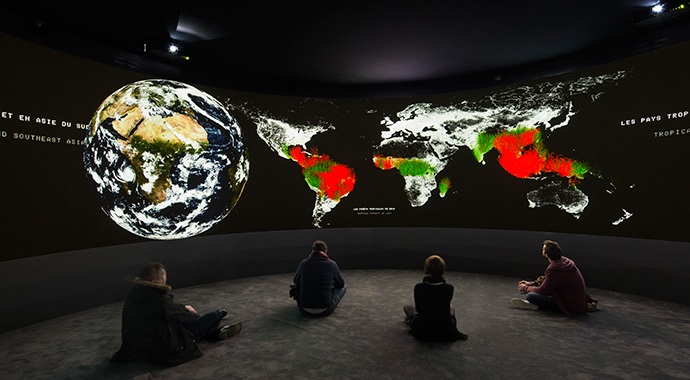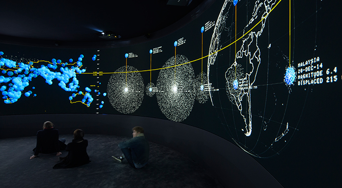 Based on a prompt by French philosopher and urbanist Paul Virilio, EXIT (2008–15) is an experimental 360-degree installation created by New York-based artists and architects Diller Scofidio + Renfro with architect–artist Laura Kurgan and statistician–artist Mark Hansen, alongside a core team of scientists and geographers. The data-driven artwork – which aims to investigate human migration and its leading causes around the world, including the impacts of climate change – was originally commissioned in 2008 by the Fondation Cartier pour l’art contemporain in Paris for its exhibition Native Land, Stop Eject, and is now a part of its collection.
