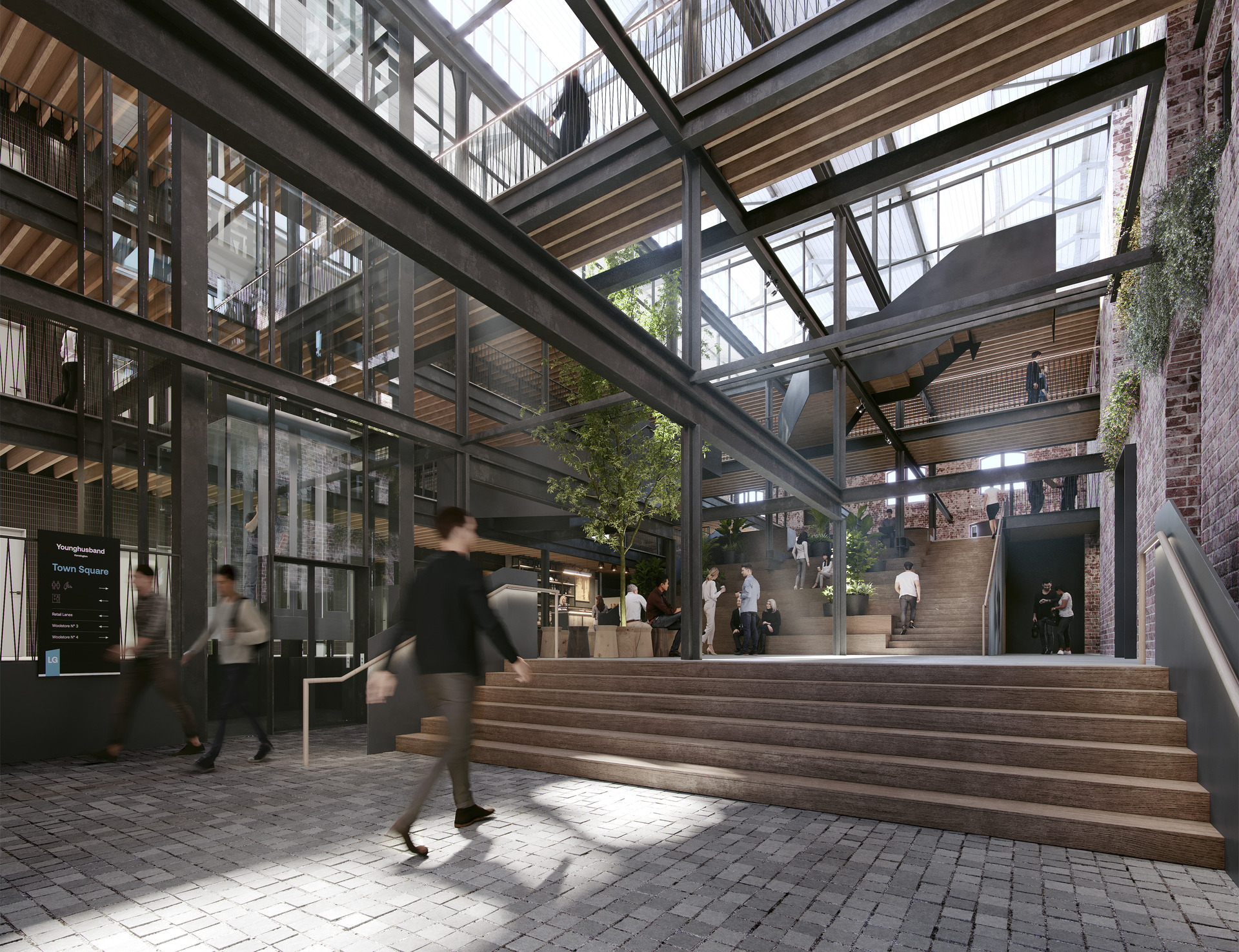 Construction is currently underway by joint-venture partners Ivanhoe Cambridge, Irongate, and Built at what will become the Younghusband precinct, a 1.57 hectare mixed-use site in Kensington that will, in its first stage, provide over 17,000sqm of adaptive reuse workplaces and ground floor retail. Its name comes from the last wool broker to trade there, who operated until 1970. The site is anchored by a 122-year-old redbrick wool store with an interior L-shaped bluestone laneway. Peter Miglis, a principal at Woods Bagot and the project leader, is excited about the reopening of the space to the communities around it. “It’s been off limits for a long time,” he says. “It’s got a beautiful laneway in it, and we wanted to open that up to everyone… to invite in the Kensington residents who have walked by it for so many years but never been able to enter.”